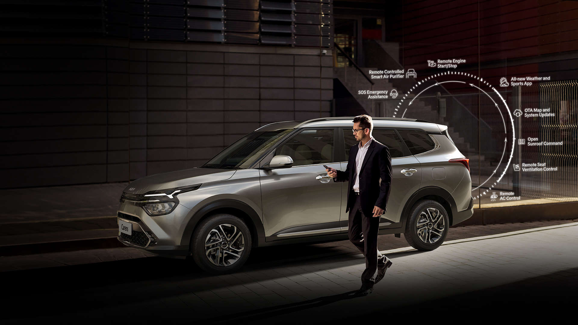 Disclaimer: The product and feature images shown on this page are for representation purpose only . All Kia Connect features are not standard across all models and may vary depending on the model and variant. Smart watch is not provided with any vehicle. Kia Connect functionality is subject to network availability in a region. Please Visit Kia dealership for more details. Kia India Pvt. Ltd. Reserves the right to make any changes to Kia Connect features without any prior notice.